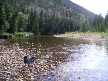 Next day the dog & I did some more experimentation. Drove to the confluence of North and South Forks and waded a good mile or so of each of them. It's very difficult to move along either of these tributaries. Bankside willows and birch make access from the bank more work than is worth describing.
